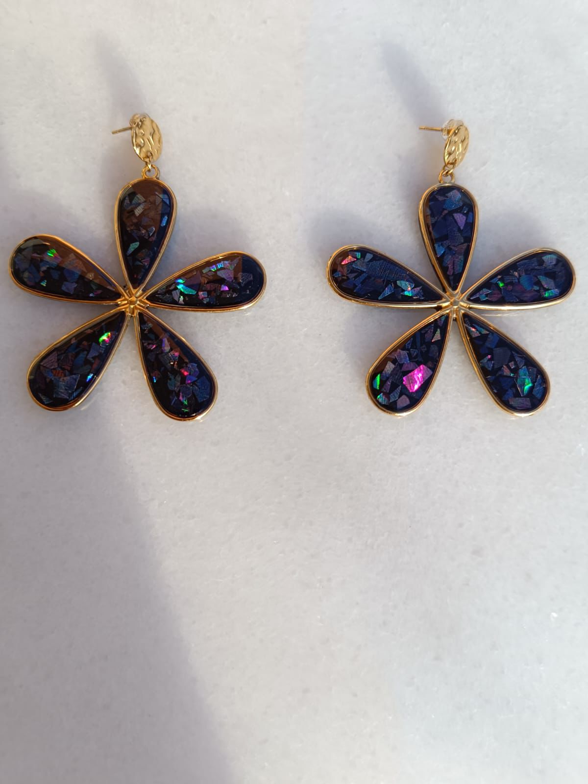 Pendiente en forma de flor hecho con arcilla polimérica de color azul marino que refleja destellos de colores. Acabado en resina brillante. Base muescada de acero inoxidable de 10 mm. Tamaño del pendiente: 7 cm de largo y 6 cm de ancho.
