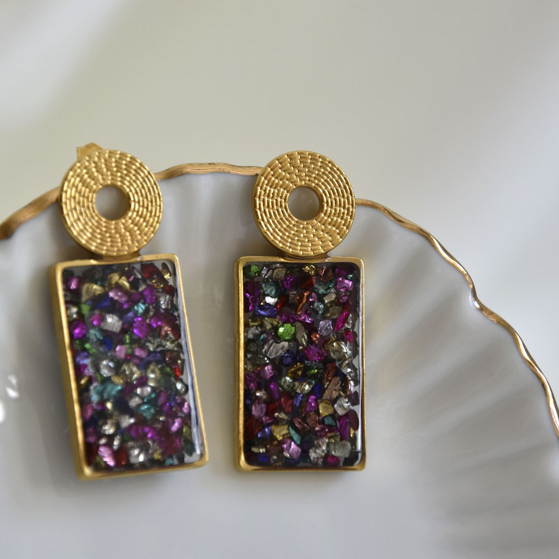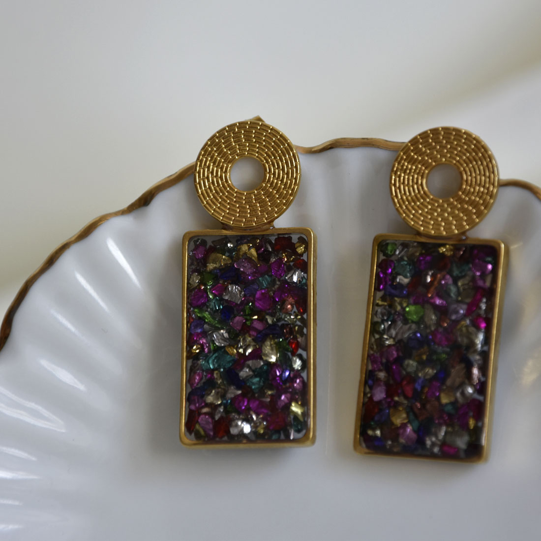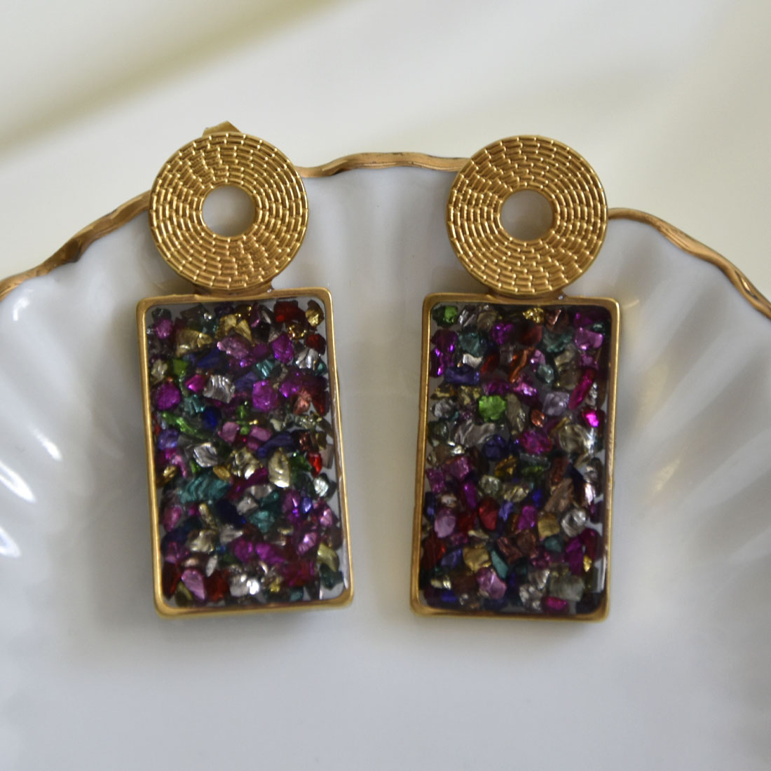 Pendiente hecho a mano de 4 cm de largo, con base circular de 14 mm muescada y hueca de acero inoxidable, seguida de piedras de colores encapsuladas en forma rectangular. Acabado en resina.