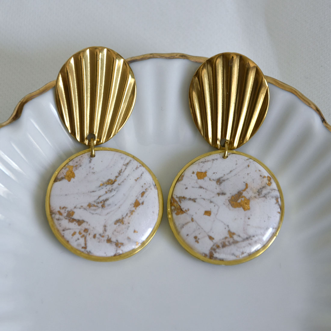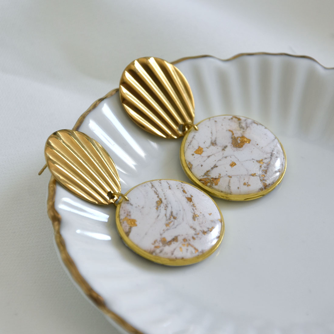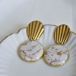 Pendiente con base metálica en forma de concha de acero inoxidable con terminación esférica de 25 mm con estampado blanco y vetas doradas de pan de oro, acabado en resina brillante.
